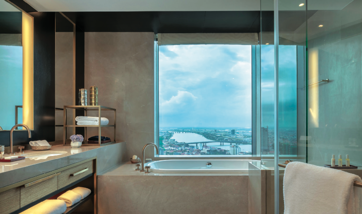 The hotel’s design is a blend of traditional Cambodian elements and contemporary elegance. The rooms are furnished with a mix of traditional Khmer art and modern amenities. Floor-to- ceiling windows ensure that natural light floods the spaces, while also allowing guests to enjoy the amazing views.