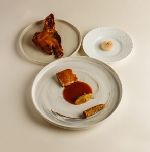 To showcase Spain’s nose-to-tail gastronomy heritage and to minimise waste, Spanish suckling pig features as the stellar main course. The brain is braised, roasted, and served with carabinero. Fat rendered with bacon is transformed into a tealight candle that melts into a luscious warm dip for freshly baked bread.