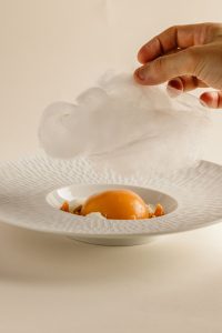 Lactic and guava dessert highlights goat’s milk. Sitting on white chocolate sand is milk mousse covered in guava glaze and topped with wispy cotton candy. Within the mousse is a dulce de leche of caramelised sugar, cloves, and milk. Finally, frozen buttermilk foam and drops of guava purée add sweet and sour nuances.
