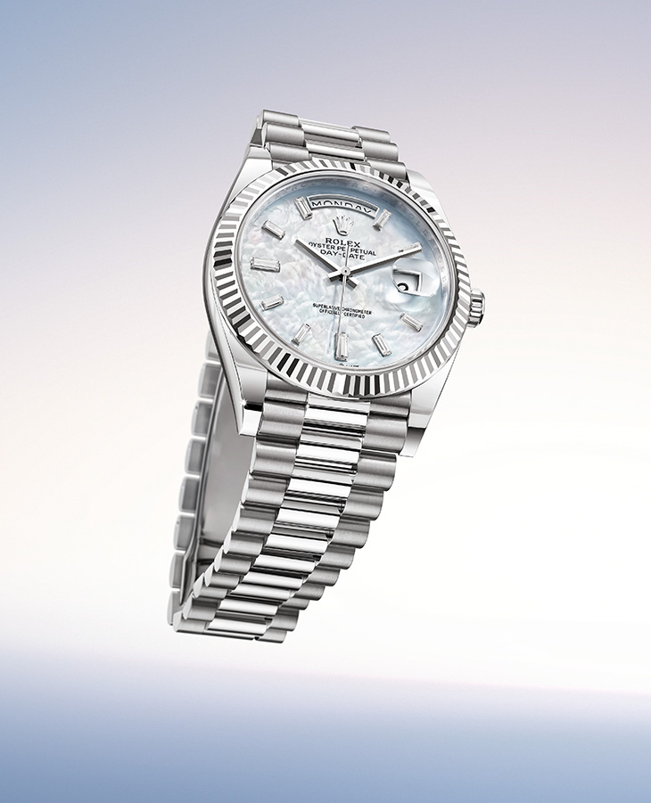 The two new Day-Date 40 models in 18 ct Everose gold and 18 ct yellow gold are highlighted by dials of ombré, coloured blue- green or in pearlised white mother-of-pearl, faceted, deconstructed Roman numerals and faceted index hour markers, and a bezel set with 60 trapeze-cut diamonds. Colours, materials, motifs, hour markers – each element contributes to the harmony of the new combinations. The new versions of the Day-Date express the brand’s enduring desire for rare and wide-ranging expertise to be found in even the smallest details.