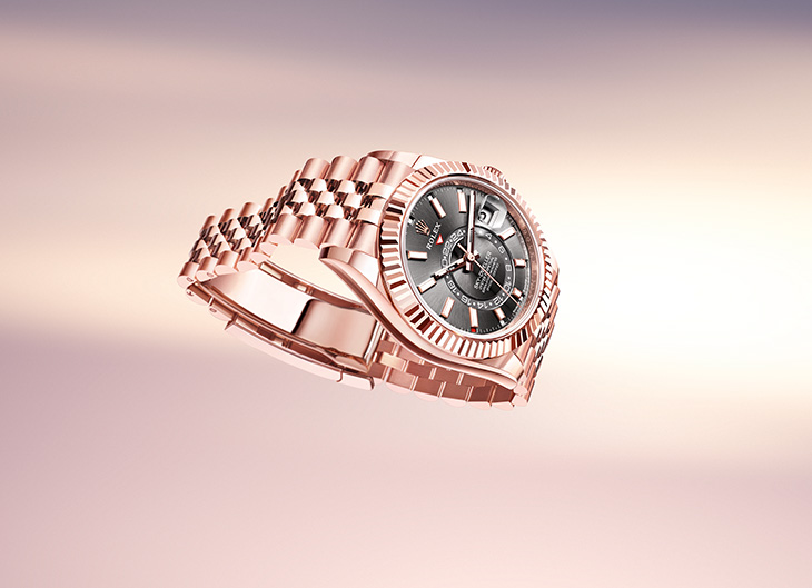 The Sky-Dweller in 18 ct Everose gold or yellow gold is now available with a Jubilee bracelet. The unique bracelet is a standout feature, with the smaller, polished centre links contrasting with the satin- finished outer links. Paired with a slate dial on the version in 18 ct Everose gold and with an intense white dial on the watch in 18 ct yellow gold, this bracelet is also appreciated for the patented ceramic inserts – designed by the brand – inside the links to enhance its flexibility on the wrist and its longevity.