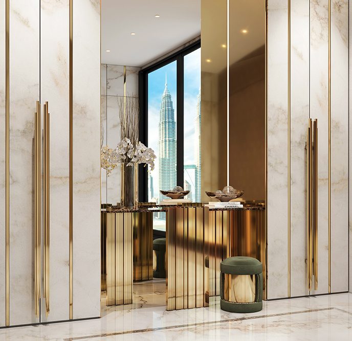 Befitting its prestigious location, the apartment’s interior decor is classically styled in a luxurious combination of marble and gold, materials that have been silent signs of wealth since ancient times. Here, marble’s unique veined style, accented by finishes such as rose-gold and bronze, have been reimagined for an elegant and modern décor.