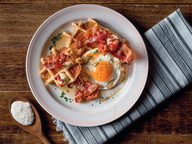 Perfect on their own, both can be enjoyed as a savoury stack; topped with a sunny side-up and crisp grilled bacon, lashings of smoked paprika-infused maple syrup, goji berries and honeyed ricotta—or with sweet ripe Thai mango, caramelised almonds and Brittany’s finest salted butter caramel sauce, complete with lemongrass-infused Chantilly and ice mint freshly plucked from the garden.