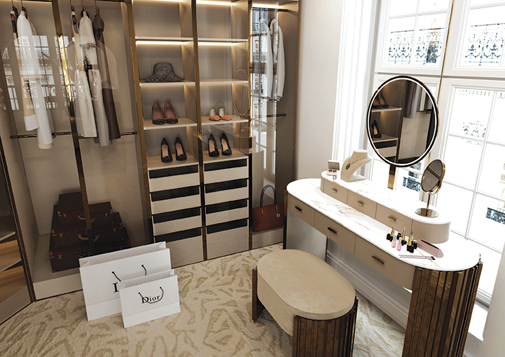 As the capital of fashion, a luxurious wardrobe for all its fashionable content is de rigueur. French glamour abounds in this feminine space, with the Empire dressing table and bench always at the ready to transform the bold woman for the perfect look befitting the occasion.