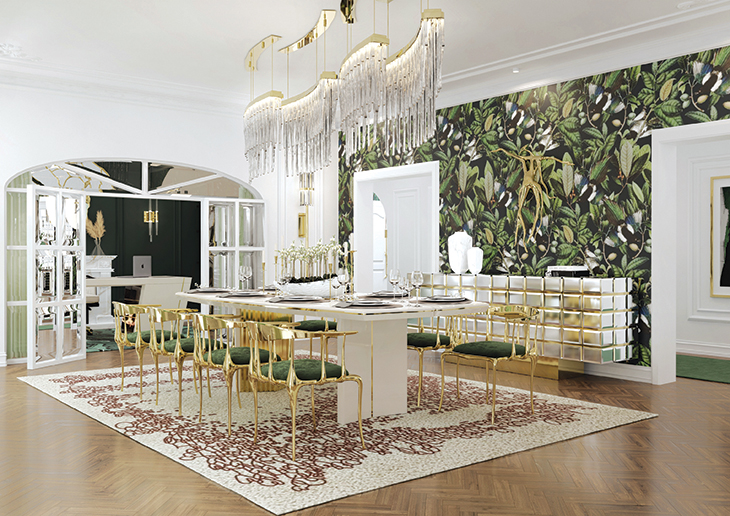 With a feminine touch, the three McQueen round suspension foliage lights with their hand-hammered leaves grant sophistication to the luxe decor. The emerald green Empire Set I centre table, made with a bespoke marble top, follows the colour palette and ties together the furniture and lighting such as the Trump II wall, Needle wall lamp, and Empire column display.