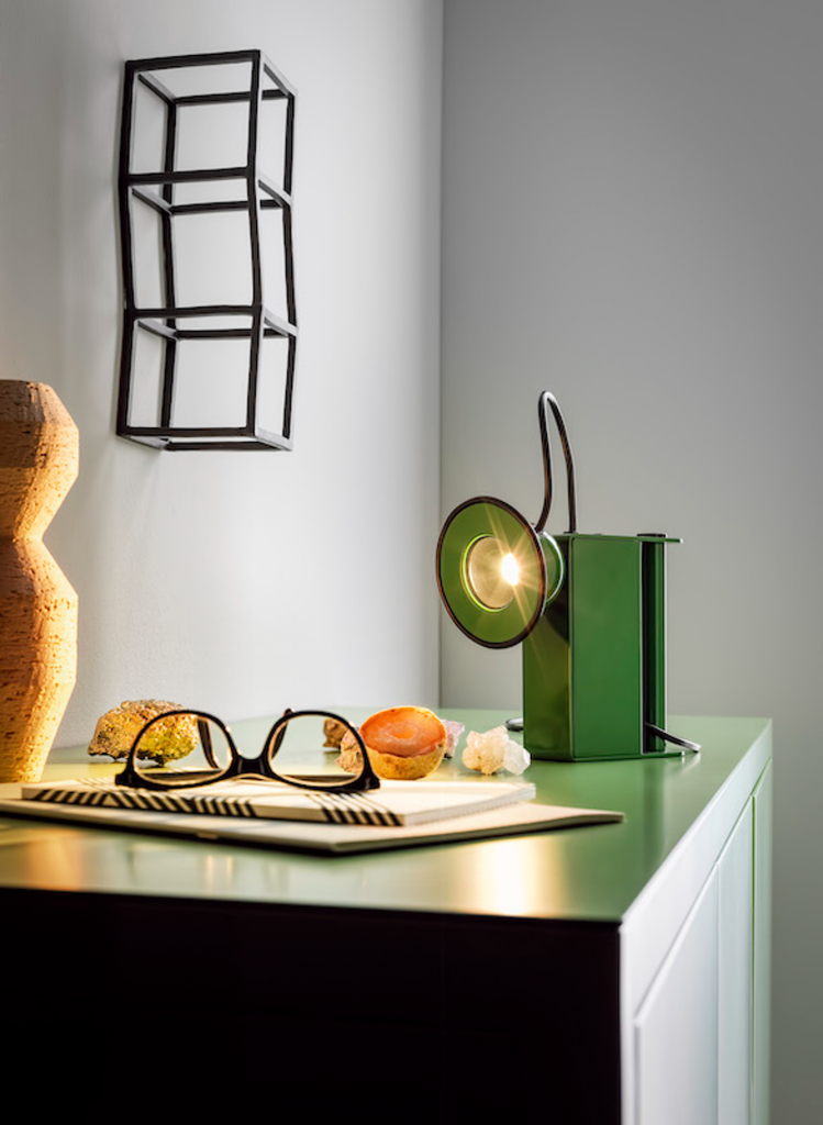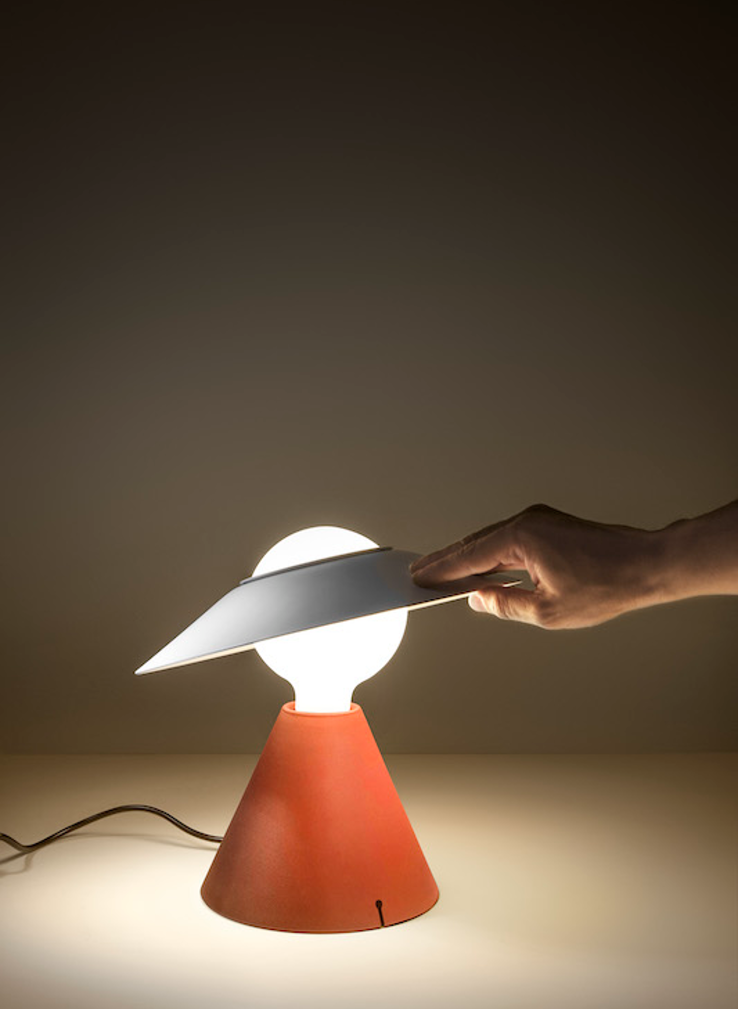 In Gravitino 541 (1969), the upper sphere housing the LED source is connected to the sphere at the base by a magnet. This type of attachment allows total freedom of movement of the light source, which can slide in any direction and rotate 360°. It is available in table, wall or ceiling versions. The shape of Bugia (1977) by Antonio Macchi Cassia is reminiscent of the old candle holders with handles – commonly called ‘bugia’ in Italian.